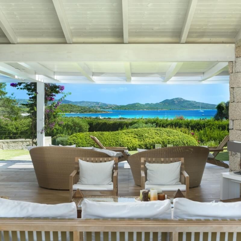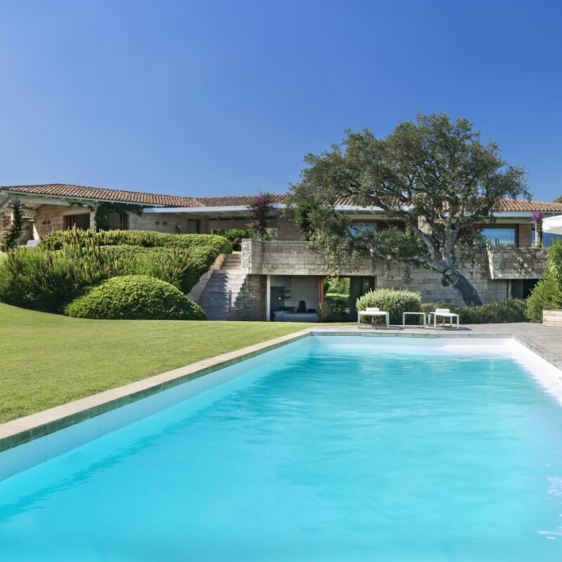 Der Garten mit einer Gesamtfläche von 4.000 Quadratmetern ist von einer Rasenfläche umgeben und mit einheimischen Pflanzen wie Erdbeerbäumen, Rosmarin und Korkeichen geschmückt. Die Außenfassaden der Villa erinnern ebenfalls an die Bauernhäuser der Gallura, da sie mit kleinen Granitblöcken verkleidet sind, genau wie die antiken Vorgänger. Der kleine Hügel, auf dem die Villa gelegen ist, bietet einen Panoramablick und gleichzeitig eine ruhige Lage, damit man einen Urlaub in absoluter Privatsphäre verbringen kann.