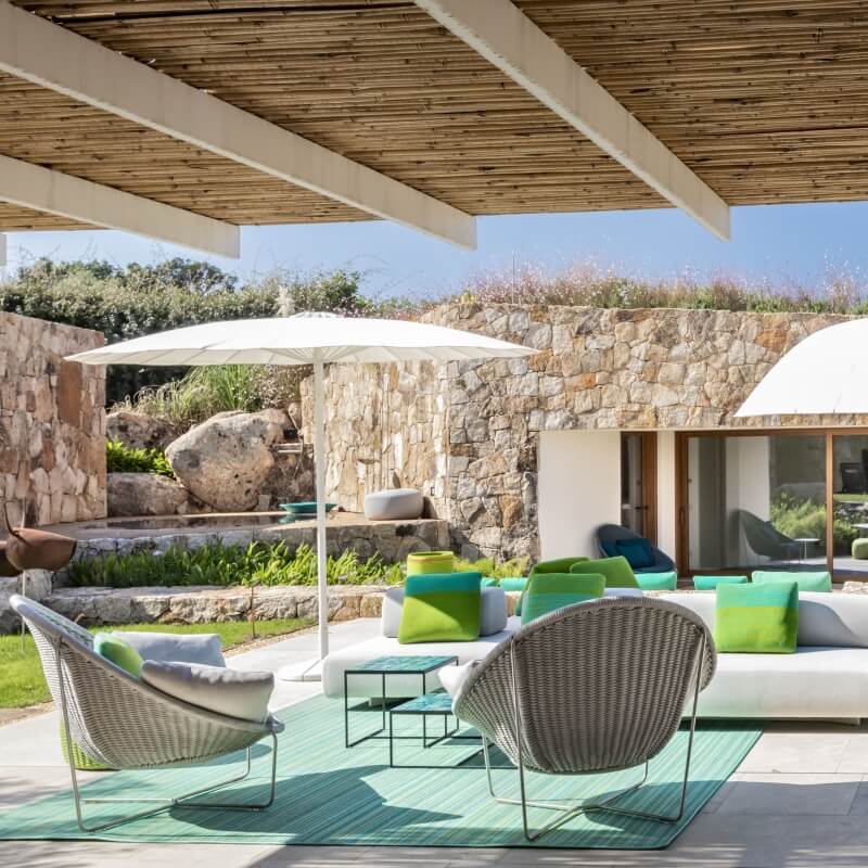 Der sorgfältig gestaltete Garten umgibt die Villa und bildet eine harmonische Symbiose aus Ruhe und natürlicher Schönheit. Üppig bepflanzt mit einheimischen Gewächsen und duftenden Blumen, ist er ein lebendiges Abbild der sardischen Flora und bietet sowohl schattige Rückzugsorte als auch sonnige Plätze, ideal, um das milde Inselklima in vollen Zügen zu genießen.