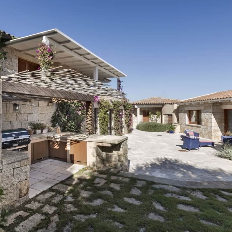 Auf der Rückseite der ersten Ebene liegen ein Innenhof mit einem Grillplatz, der die erste Ebene vom zweiten Teil der Villa trennt, der im Gegensatz zur ersten Ebene auf zwei Etagen aufgebaut ist. Auf der Ebene des Innenhofs befinden sich die technischen Räume wie Waschküche, Lager und Personalraum, während die erste Etage aus zwei Doppelzimmern mit eigenem Bad besteht. Jedes hat seinen eigenen, unabhängigen Zugang über eine kleine Veranda mit Meerblick. Hinter dem zweiten Bereich befinden sich zwei weitere Schlafzimmer mit Doppelbett und eigenem Bad, von denen eines über eine Sonnenterrasse verfügt, die über eine Außentreppe erreichbar ist.