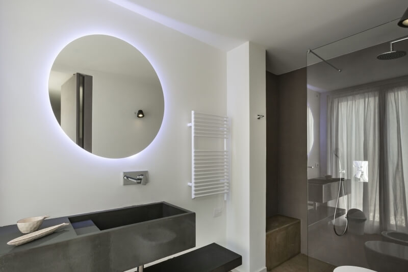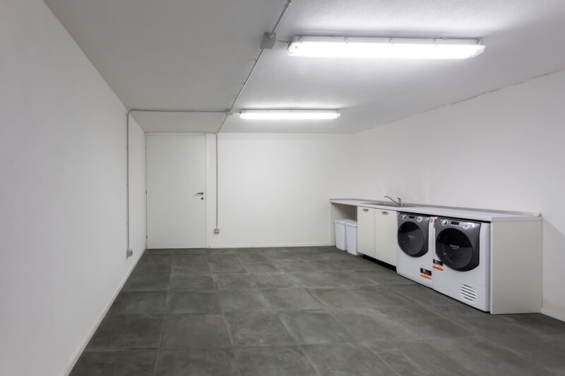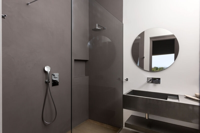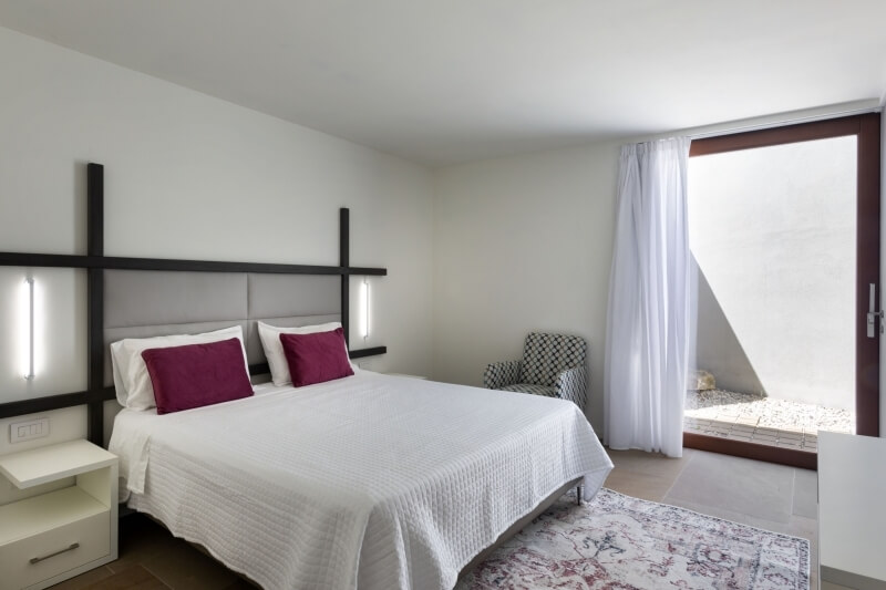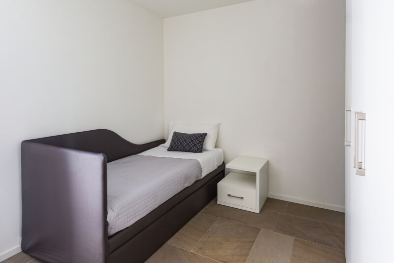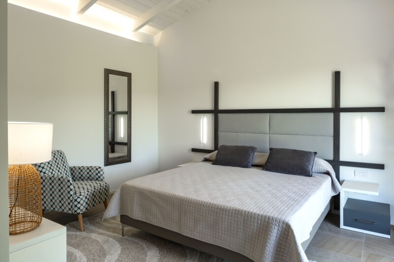 Unmittelbar nach dem Eingang führt ein 20 Meter langer, in den Rasen eingelassener Weg aus Granit zum ersten Teil der Villa, der aus zwei Schlafzimmern mit eigenem Bad besteht. Die Wände der Schlaf- und Badezimmer sind in einem hellen Grauton gehalten, der gut zu den Möbeln und den weißen Vorhängen passt. Die beiden Räume sind durch einen kleinen Flur miteinander verbunden, der auf der linken Seite zu zwei großen Technikräumen führt, von denen einer als Wasch- und Bügelraum und der andere als Lagerraum genutzt wird. Auf der rechten Seite des Korridors, der die beiden Schlafzimmer verbindet, führt eine Glastür zu zwei weiteren Schlafzimmern, einem Doppel- und einem Einzelzimmer; beide Schlafzimmer haben ein eigenes Bad.