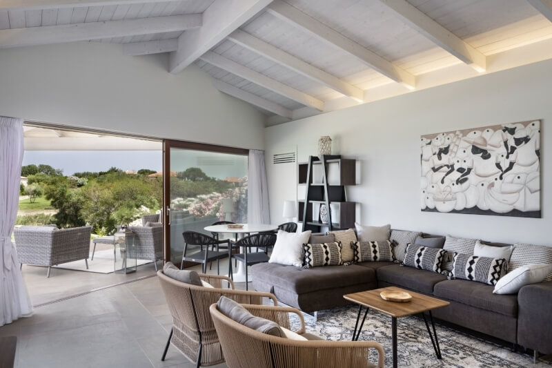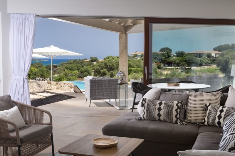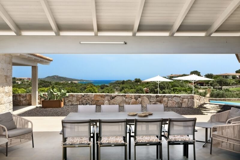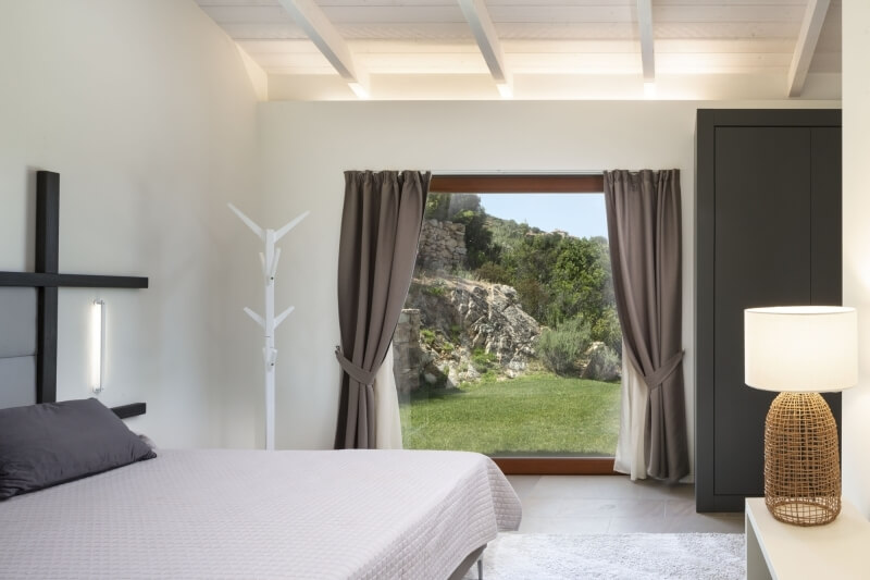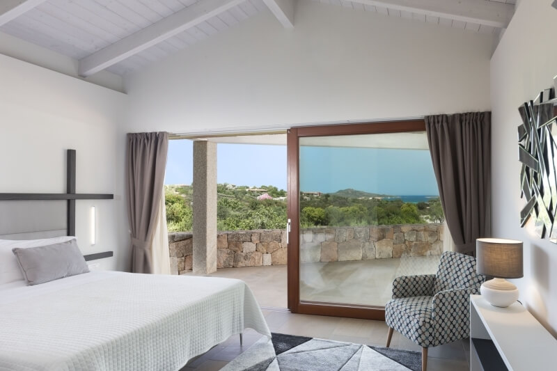 Ebenfalls durch die Glastür gelangt man über eine Treppe auf die Terrasse mit Blick auf den Pool und den Strand Lu Impostu. Am Scheitelpunkt der Treppe, auf der rechten Seite, führt eine Glas- und Holztür zum Hauptschlafzimmer, das etwa 30 Quadratmeter groß ist und über ein eigenes Bad und eine Veranda mit Meerblick verfügt. Neben dem Hauptschlafzimmer befindet sich ein weiteres Schlafzimmer, ebenfalls mit eigenem Bad und einer Glasschiebetür mit direktem Zugang zum Garten.