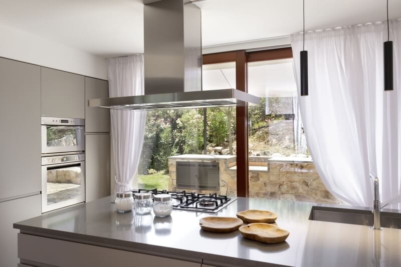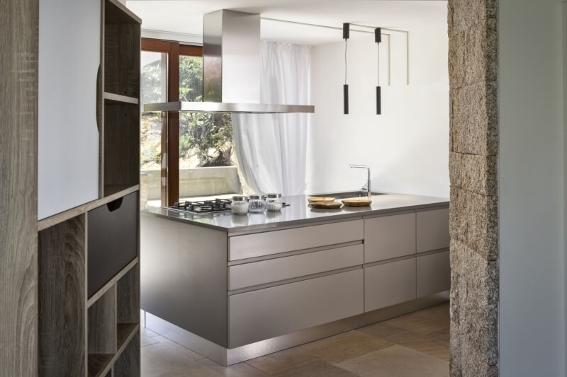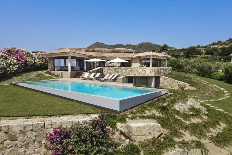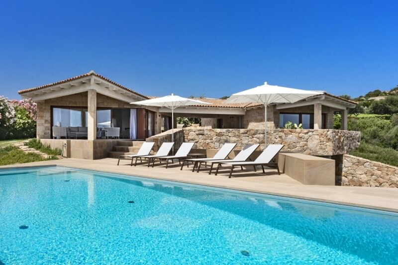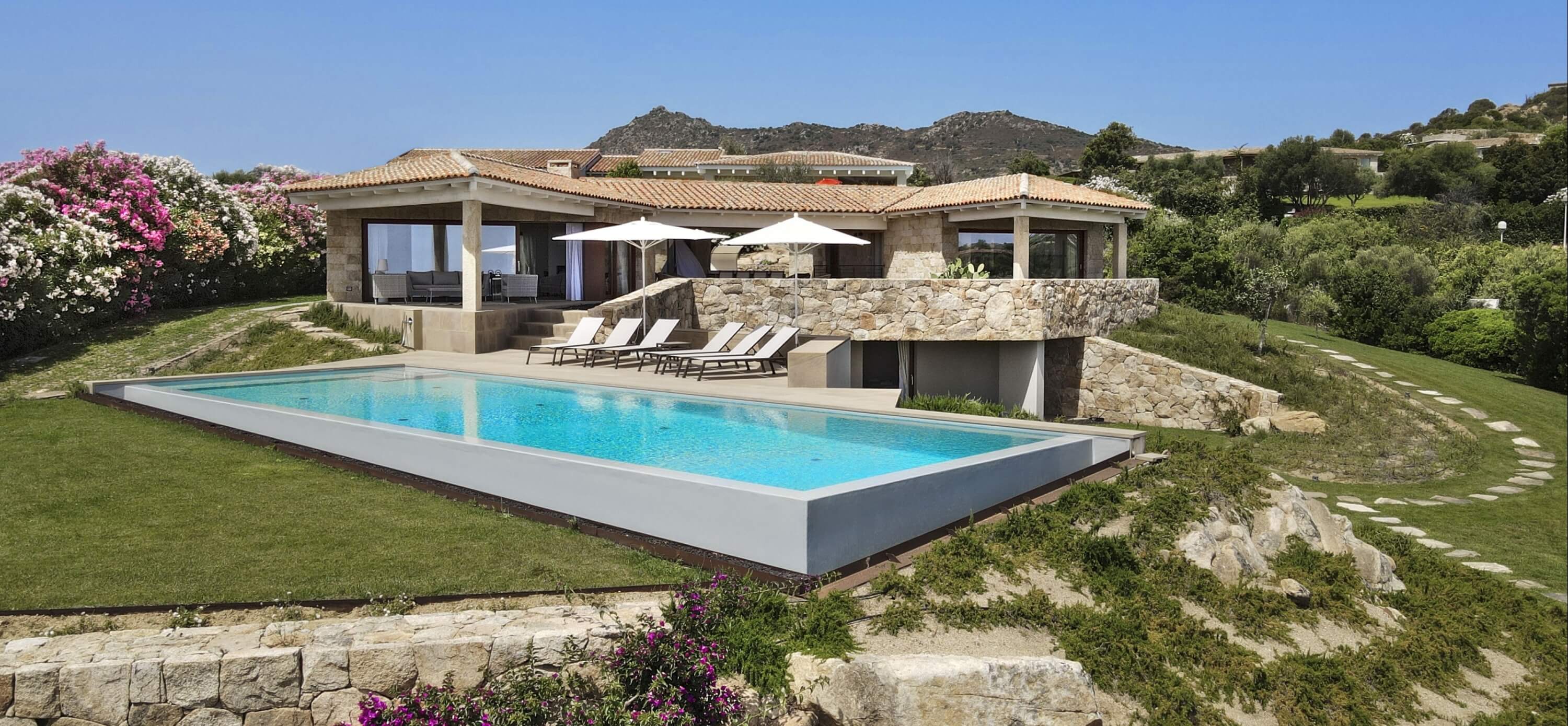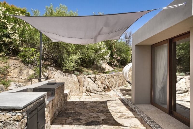 Der rechteckige Swimmingpool ist nach Osten ausgerichtet und erlaubt es, den Blick auf das Meer zu genießen, während man sich im milden Wasser erfrischt. Auf der Rückseite der Villa wurde ein windgeschützter Bereich für die Außenküche und den Grill entworfen.
