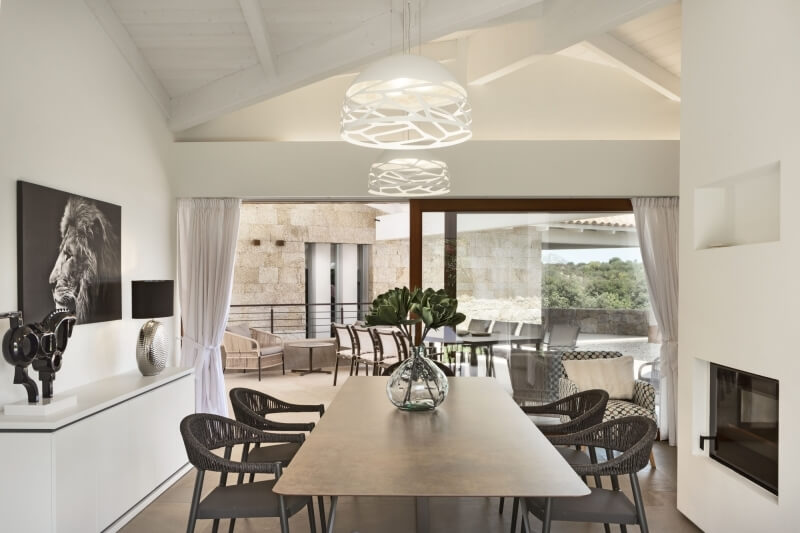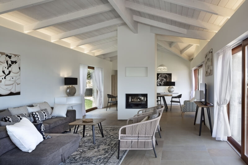 Auf der rechten Seite der Veranda, mit Blick auf das Meer und den Pool, befindet sich der Wohnbereich, der aus einem lichtdurchfluteten Wohnzimmer mit Schiebefenstern auf drei Seiten des Raumes besteht, wo die weißen Vorhänge in der leichten Meerbrise wehen und ein Gefühl von Freiheit vermitteln. Die offene Küche ist mit einer Kücheninsel und allen Annehmlichkeiten ausgestattet, die für einen exklusiven Aufenthalt sorgen.