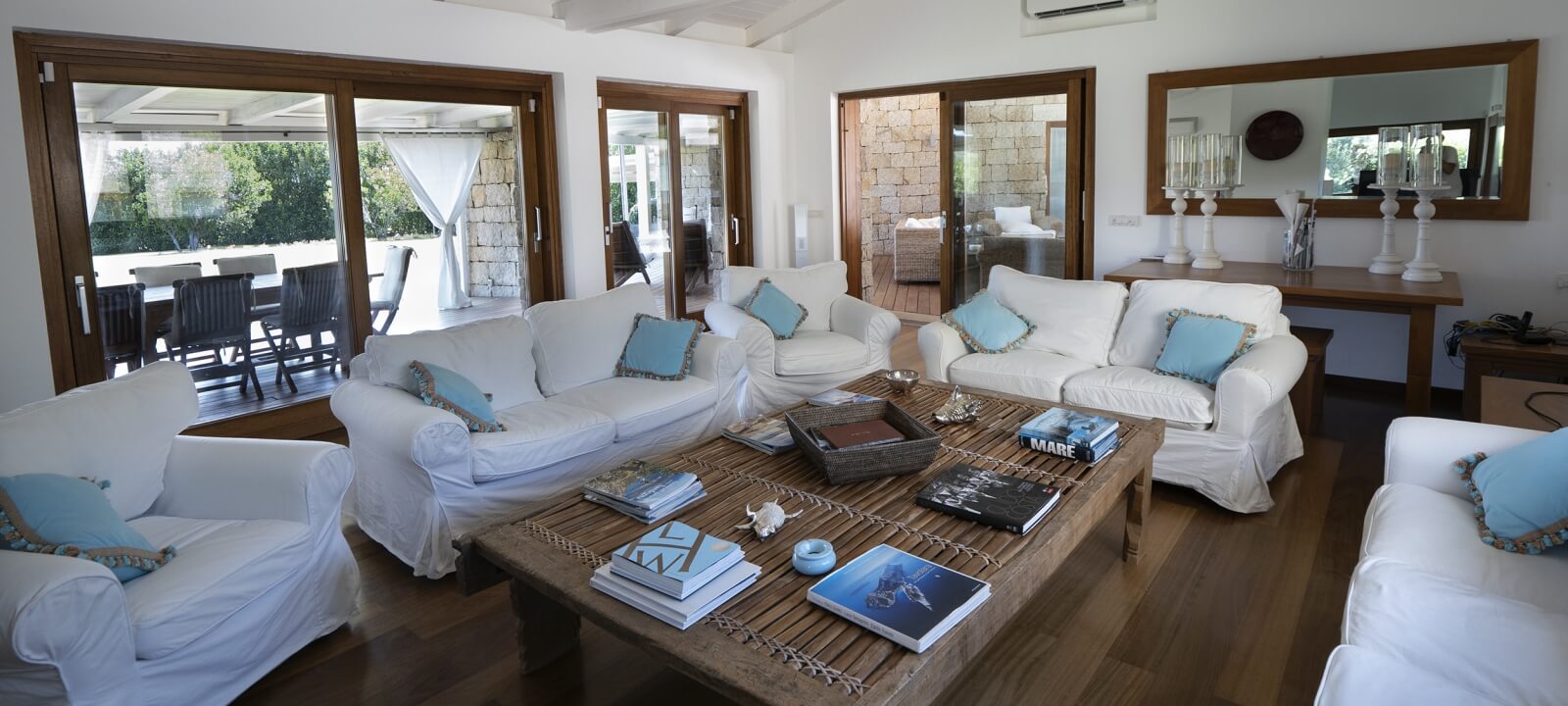 Following on from the kitchen is the dining room, which is spacious and bright and is equipped with a table with chairs and benches and a TV area with sofas and armchairs further back. This large room overlooks the pool area and the lawn to the right and an internal courtyard to the left that leads to the other blocks of the house.