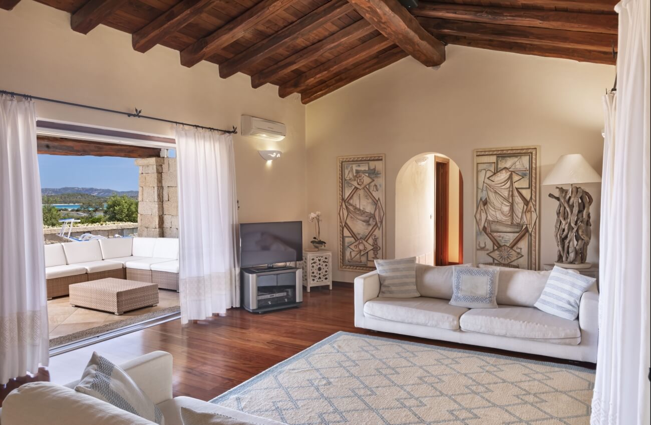Upon entering the ground floor of Villa Sofia through a wooden door to the right, you are welcomed into the living area. This space features a large sliding glass window that frames stunning views of Tavolara Island and the beach below. The room is bathed in natural light, enhanced by light-colored curtains that accentuate the white wooden ceiling and white sofas, creating a bright and airy atmosphere.