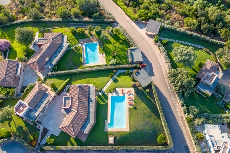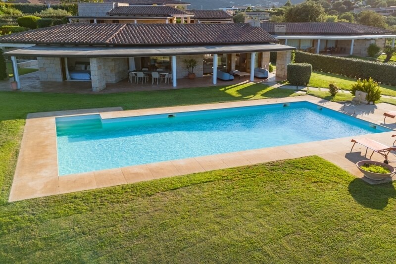 Au centre, une piscine élégante invite à la baignade, tandis qu’une terrasse panoramique offre une vue à couper le souffle sur la baie de Lu Impostu, l’une des plus emblématiques de