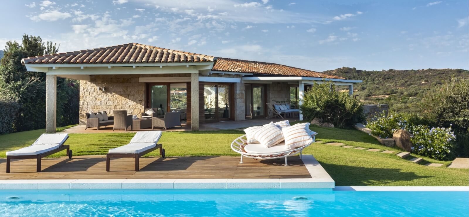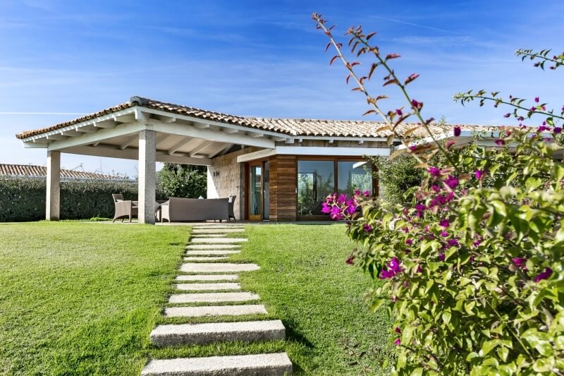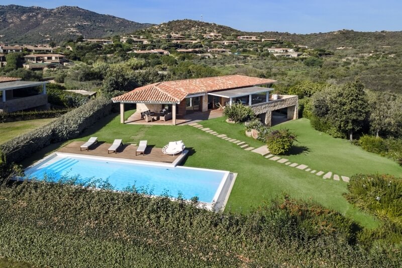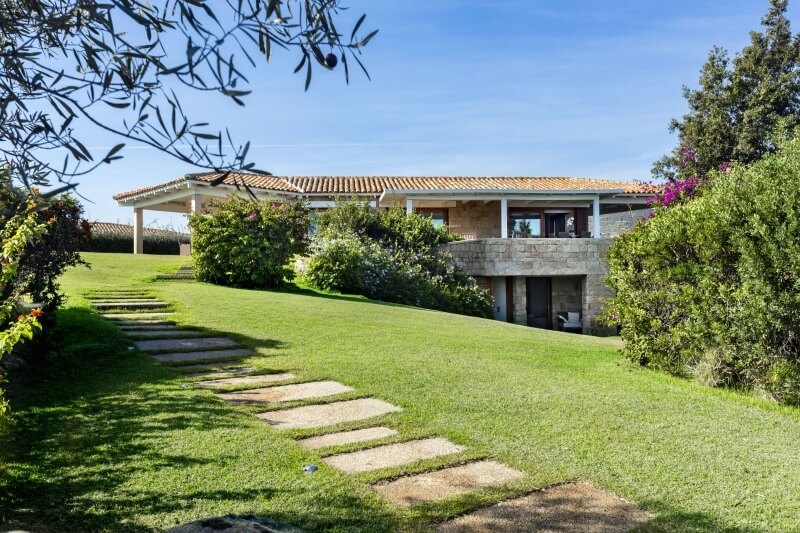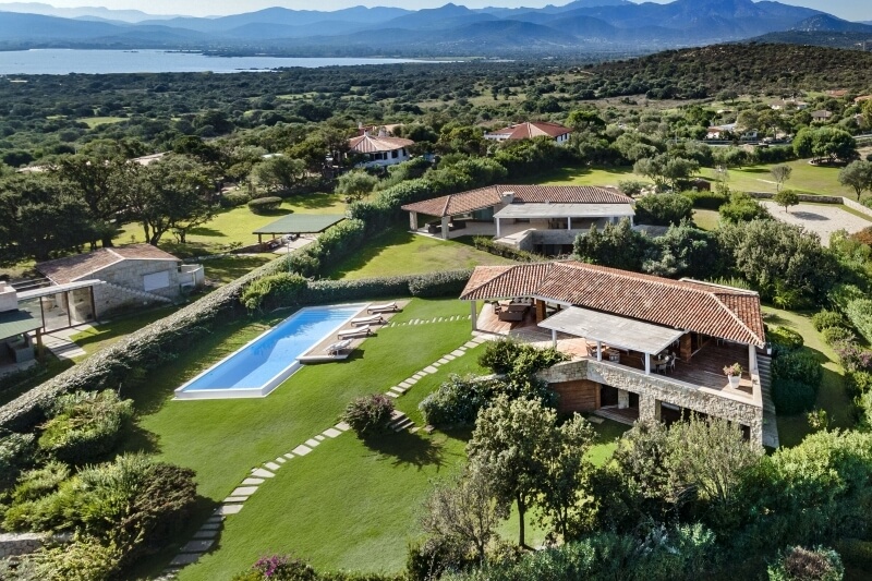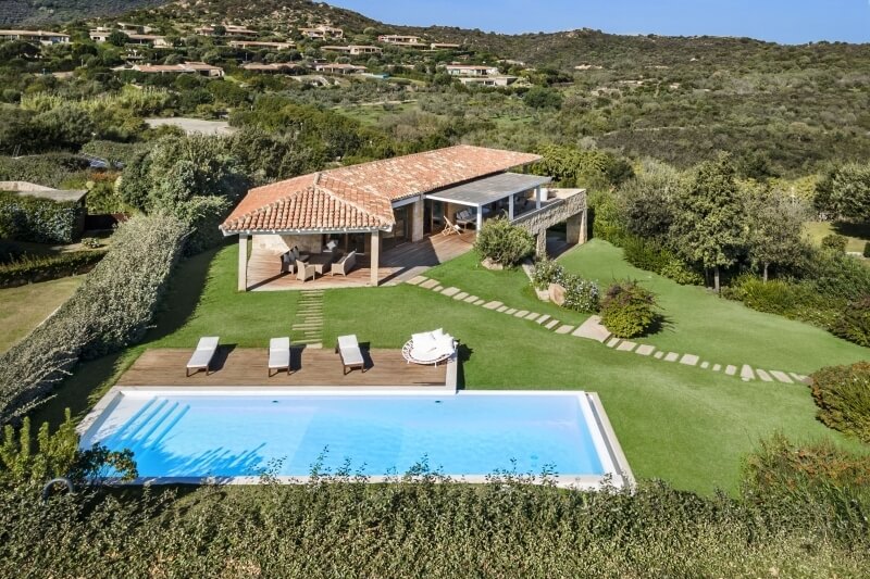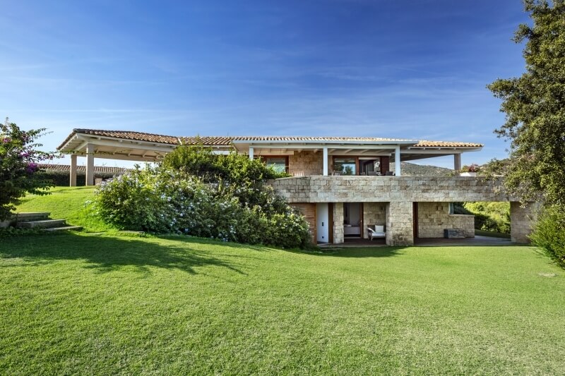Villa Corallo, comme les autres villas du quartier, rappelle par son architecture l'ancien Stazzo Gallurese, l'habitation typique de la Gallura d'autrefois, caractérisée par son toit en pente. Naturellement, ce style architectural a été habilement harmonisé avec une touche de modernité, donnée par les grandes fenêtres (le stazzo avait des cadres de fenêtre très petits) et les grandes vérandas (le stazzo n'avait pas de vérandas). La très grande véranda, qui entoure la villa sur trois de ses quatre côtés, est le fantastique trait d'union entre l'extérieur et l'intérieur, grâce à sa polyvalence d'utilisation et grâce à son aménagement, puisqu'elle peut être utilisée, par exemple, aussi bien pour un apéritif avant le dîner que pour le dîner lui-même en compagnie de parents et d'amis. L'espace piscine, avec chaises longues, est situé à droite de la villa, face à la mer, à seulement 15 mètres de la villa elle-même. Les murs extérieurs et le toit de Villa Corallo sont un hymne aux matériaux typiques utilisés par les anciens bâtisseurs de Gallura, à savoir la pierre reine de Sardaigne, le granit et les coppi (tuiles), totalement récupérés des anciens bâtiments indigènes et réutilisés dans les toits de villas comme Villa Corallo.