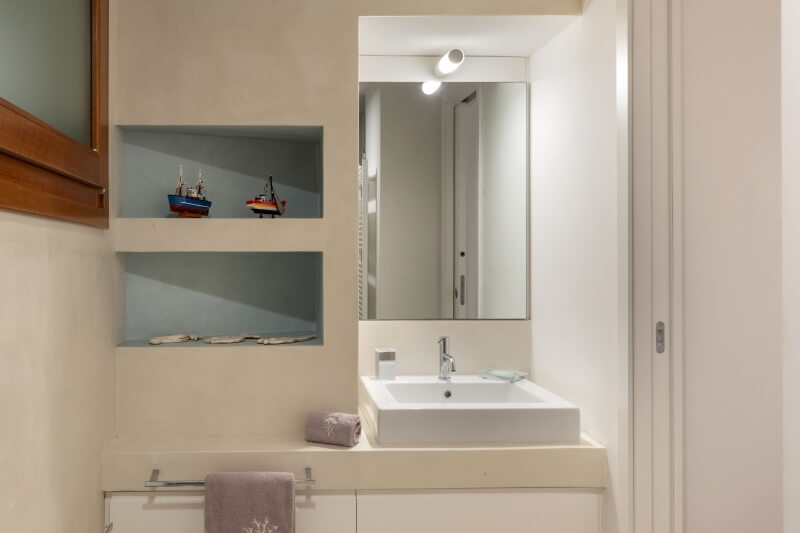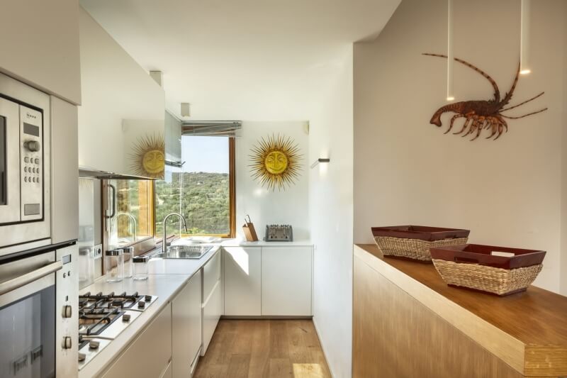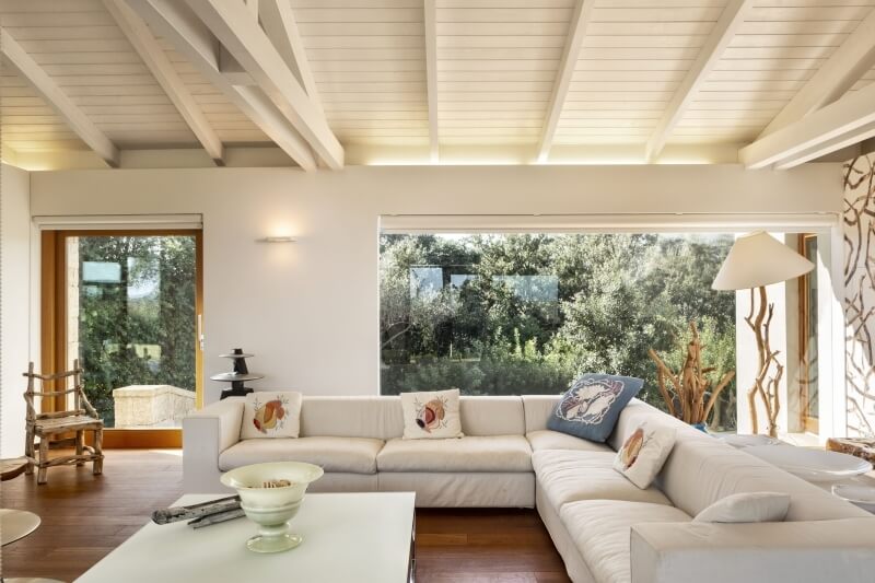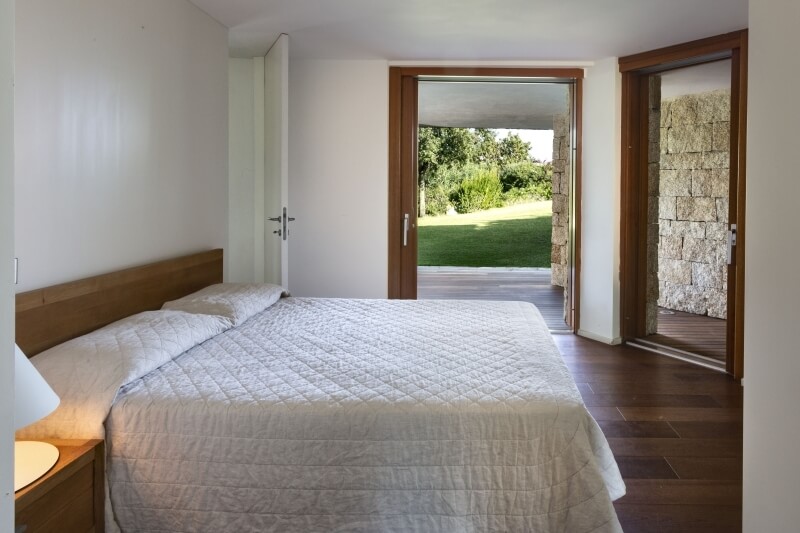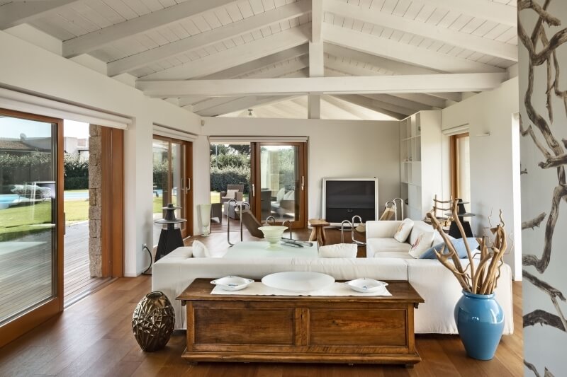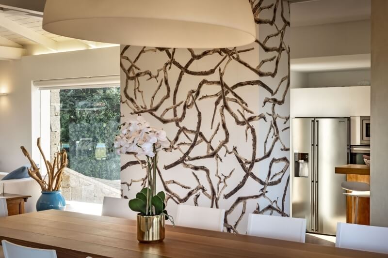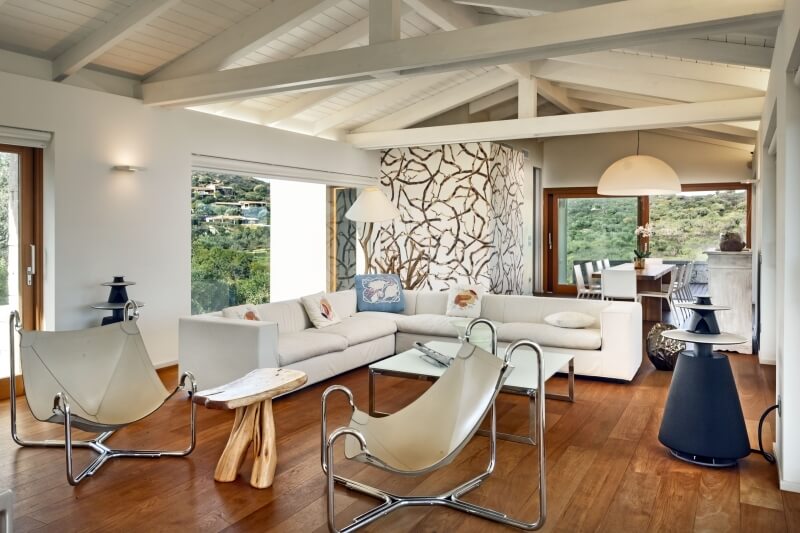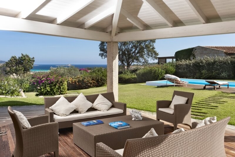 Villa Corallo, comme les autres villas du quartier, rappelle par son architecture l'ancien Stazzo Gallurese, l'habitation typique de la Gallura d'autrefois, caractérisée par son toit en pente. Naturellement, ce style architectural a été habilement harmonisé avec une touche de modernité, donnée par les grandes fenêtres (le stazzo avait des cadres de fenêtre très petits) et les grandes vérandas (le stazzo n'avait pas de vérandas). La très grande véranda, qui entoure la villa sur trois de ses quatre côtés, est le fantastique trait d'union entre l'extérieur et l'intérieur, grâce à sa polyvalence d'utilisation et grâce à son aménagement, puisqu'elle peut être utilisée, par exemple, aussi bien pour un apéritif avant le dîner que pour le dîner lui-même en compagnie de parents et d'amis. L'espace piscine, avec chaises longues, est situé à droite de la villa, face à la mer, à seulement 15 mètres de la villa elle-même. Les murs extérieurs et le toit de Villa Corallo sont un hymne aux matériaux typiques utilisés par les anciens bâtisseurs de Gallura, à savoir la pierre reine de Sardaigne, le granit et les coppi (tuiles), totalement récupérés des anciens bâtiments indigènes et réutilisés dans les toits de villas comme Villa Corallo.
