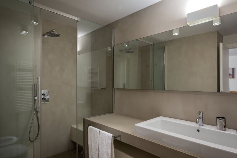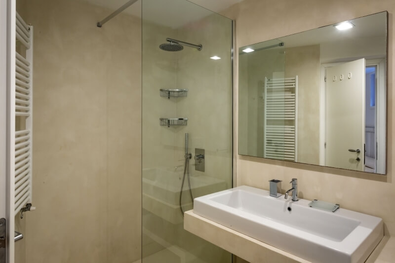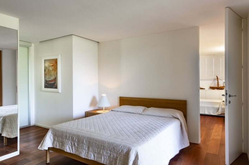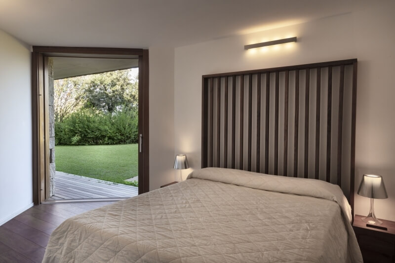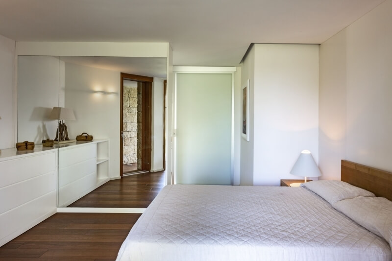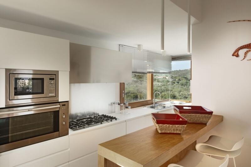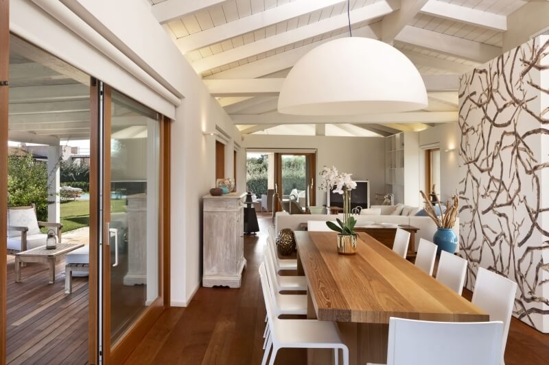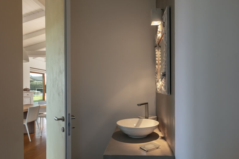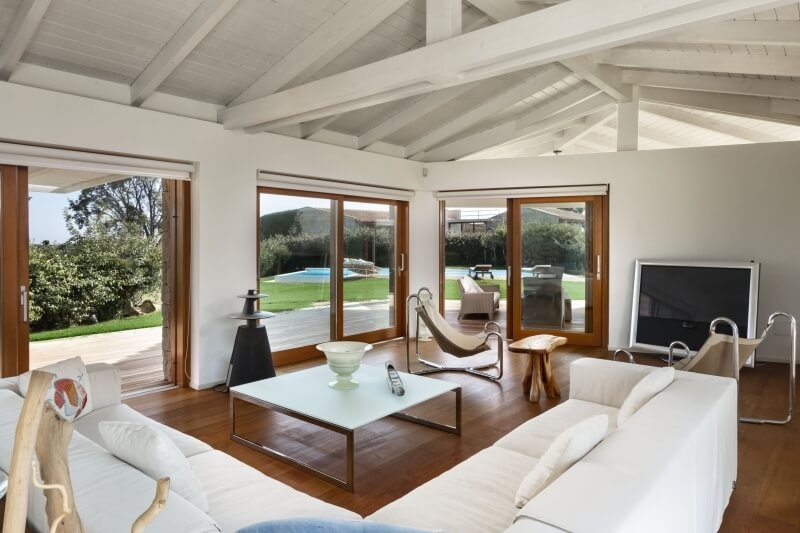 L'unique espace de vie est situé au rez-de-chaussée et se compose de la salle à manger et du salon, réunis en une seule grande pièce, et d'une cuisine équipée de tout le confort, séparée de la salle à manger par seulement trois marches qui la placent à un niveau légèrement inférieur au reste de l'espace de vie. Les quatre grandes baies vitrées coulissantes donnent à l'intérieur du rez-de- chaussée une luminosité intense et agréable et permettent d'accéder à la grande véranda et au jardin depuis la salle à manger et le salon. Le sous-sol, auquel on ne peut accéder que de l'extérieur de la villa, car il n'y a pas de liaison interne directe entre les deux niveaux, comprend trois chambres doubles, dont une à usage familial, quatre salles de bains et une salle de bains de service, ainsi que la buanderie. Toutes les pièces de la villa sont climatisées, ce qui permet de se rafraîchir pendant les chaudes journées d'été. Le rez-de-chaussée et le sous-sol sont dotés d'un sol en parquet, sur lequel il est fantastique de marcher pieds nus, tandis que les équipements, tant à l'intérieur qu'à l'extérieur, sont en bois.