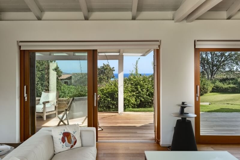 La Villa Corallo fait partie du quartier "I Giardini d'Aldia", un beau village composé uniquement de villas individuelles, construit derrière la plage de Lu Impostu et sur une bande de terrain d'environ 32 hectares. Il s'agit d'un bâtiment unique, construit sur deux niveaux (rez-de-chaussée et sous-sol), avec de grandes fenêtres coulissantes sur les deux niveaux.