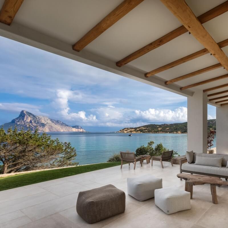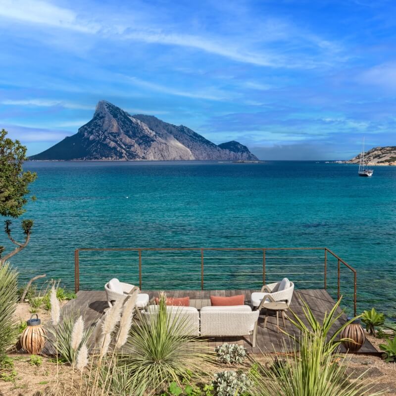 L’architecture de la villa s’intègre parfaitement à son environnement naturel et se déploie sur plusieurs structures interconnectées. Au cœur de la propriété se trouve l’espace de vie principal, où la cuisine, la salle à manger et le salon baigné de lumière s’enchaînent harmonieusement. Deux grandes baies vitrées inondent la pièce de lumière naturelle, tandis que l’une d’elles encadre une vue spectaculaire sur Tavolara, tel un tableau vivant qui sublime la beauté du paysage.