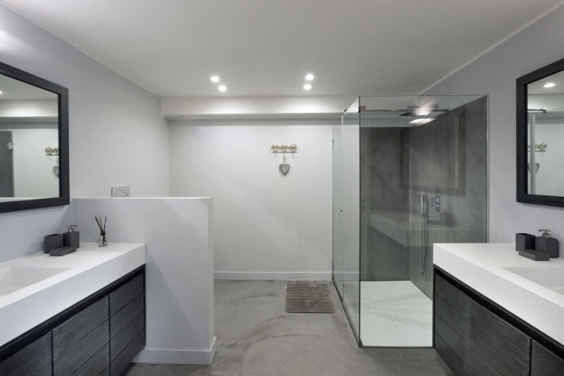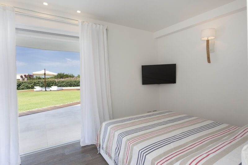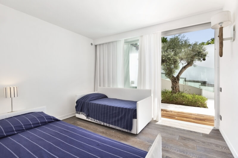 À l'étage inférieur, la partie nuit se compose de trois autres chambres doubles, d'une chambre à deux lits, des locaux techniques ainsi que de la zone de service, comprenant une autre chambre double pour le personnel et un espace récréatif pour les enfants. Les chambres principales sont meublées dans un style minimal et moderne, conforme au concept de la propriété.Celle-ci est équipée d'une télévision à écran plat, de la climatisation, du Wi-Fi, d'une salle de bains privée et de grandes armoires blanches.