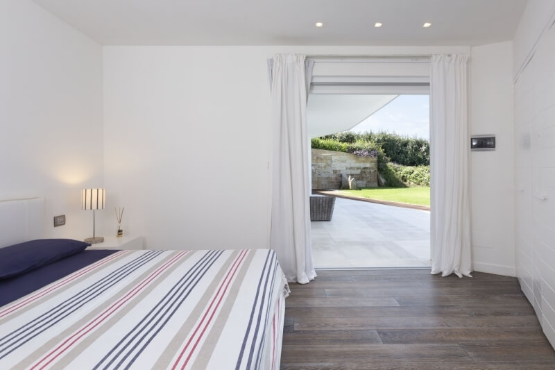 La chambre principale, située à l'étage supérieur est enrichie par une splendide vue surmer, et complétée par un lit simple pour les familles avec enfants. La salle de bains attenante se compose de deux sections, ce qui la rend plus fonctionnelle pour les occupants. On peut accéder à la chambre depuis la véranda de l'étage supérieur, soit par le salon, ou encore par l'escalier menant aux jardins des deux côtés.