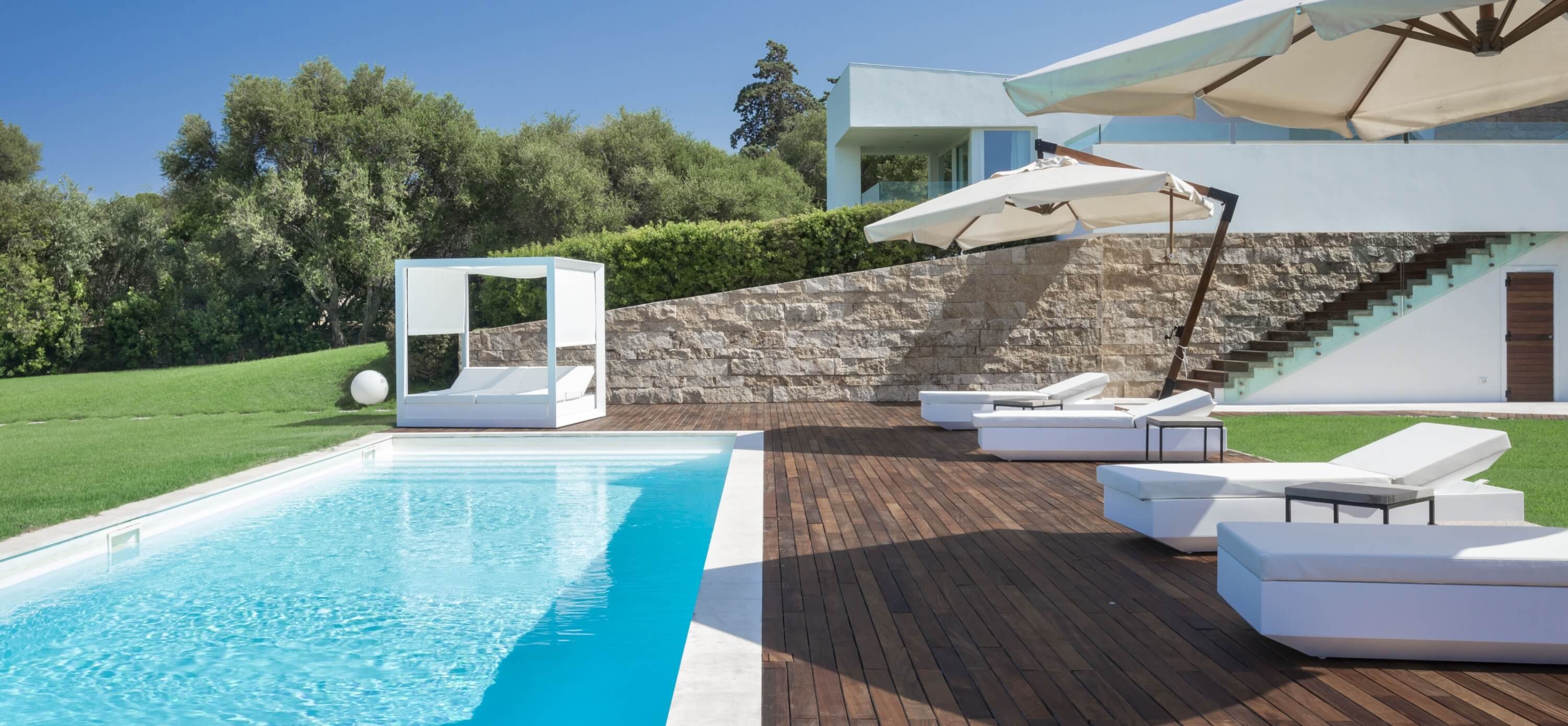 En entrant dans la propriété, on remarque d’abord les couleurs vives du vert de son jardin, créant un fort contraste avec le bleu de la piscine. Puis, le blanc luminescent des murs et du mobilier extérieur, entièrement rénové. L’ensemble forme un mariage parfait entre le style architectural des villas de la côte Est américaine et le style traditionnel typique de la Galluraaux murs extèrieurs en pierres.