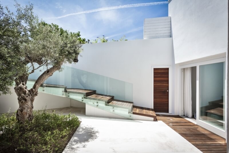 La cour intérieure, un espace qui offre une totale discrétion, est dominée par un olivier séculaire immergé dans la blancheur habituelle qui caractérise la villa.