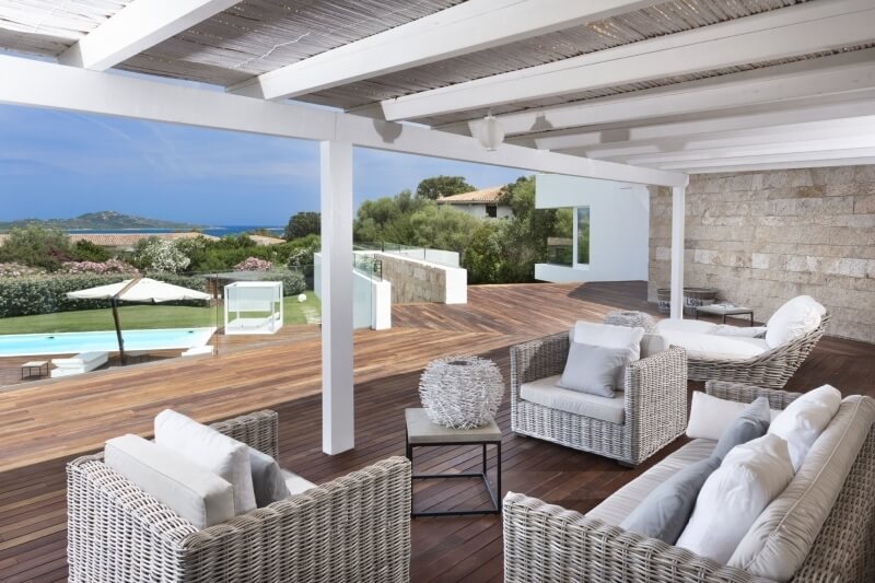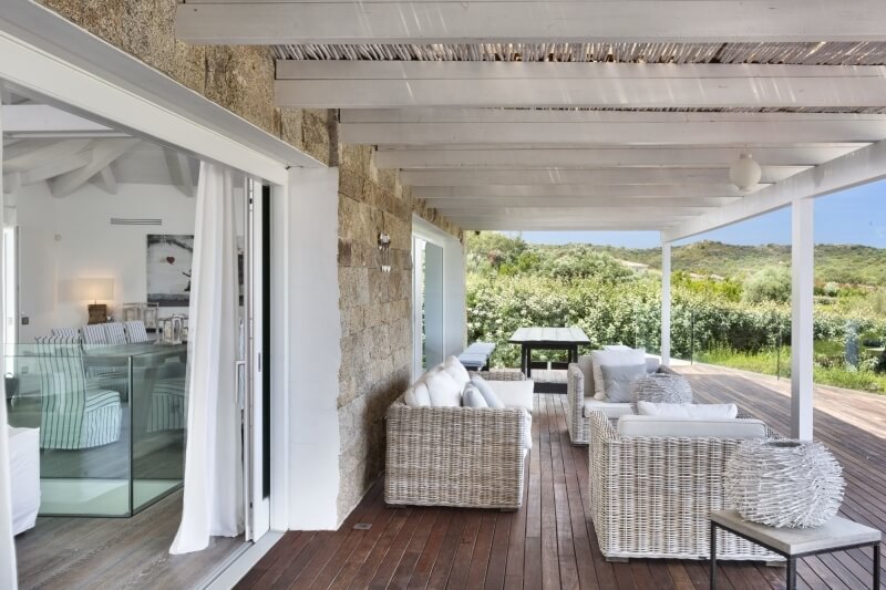 La propriété dispose d'une grande et confortable véranda qui entoure tout l'étage avec une vue splendide de la côte et du jardin méditerranéen luxuriant. La véranda a été aussi bien conçue et aménagée pour des agréables repas en plein air et des moments de détente dans la douceur du climat sarde.