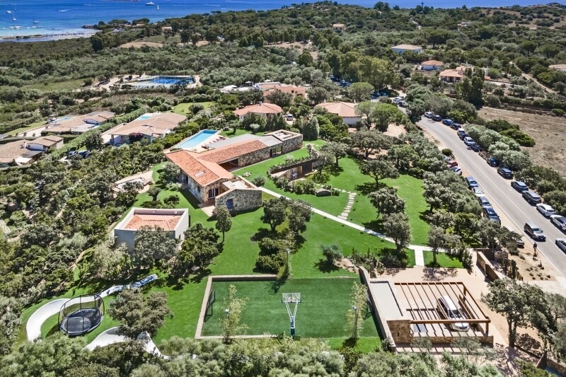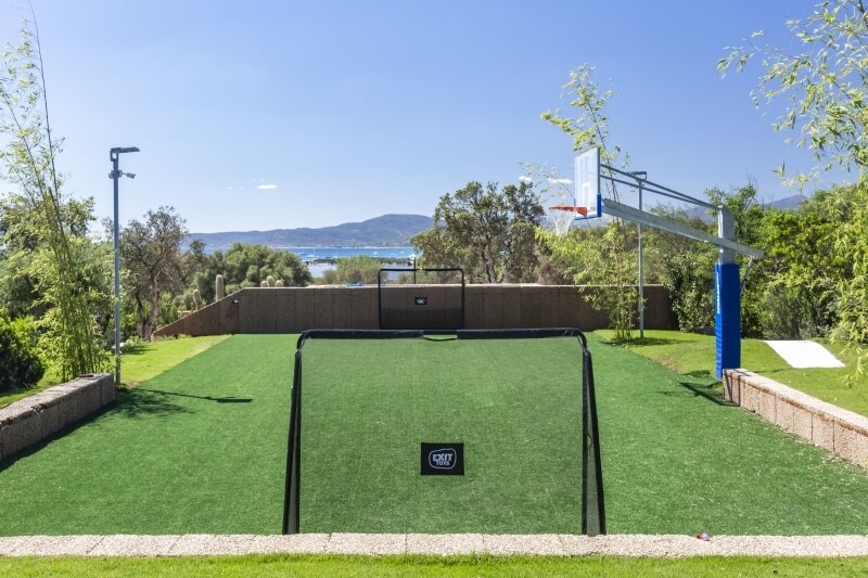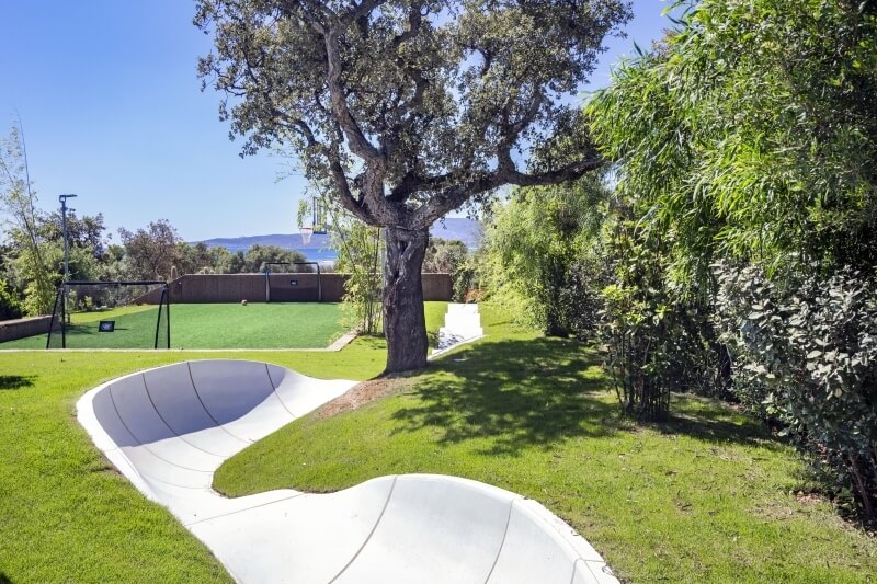 Le jardin, entièrement recouvert de gazon anglais, s'étend sur environ 5.000 mètres carrés, offrant à la villa une intimité et une discrétion inégalées. Un autre point fort est la grande zone dédiée aux activités sportives telles que le football ou le basketball, avec un terrain spacieux et un panier de basketball. Pour les amateurs de skateboard, il y a une piste en béton encastrée dans le gazon anglais.