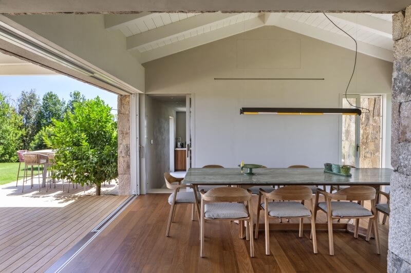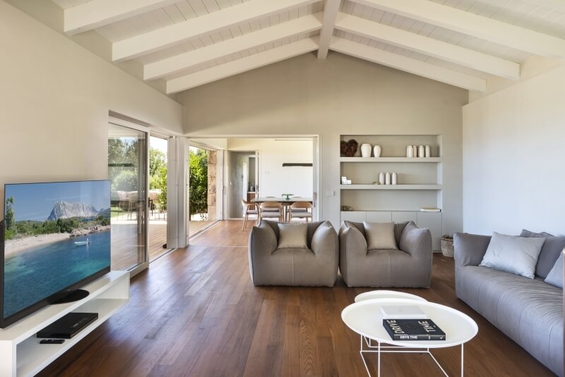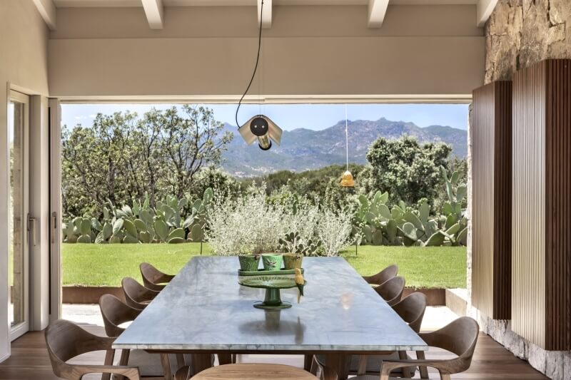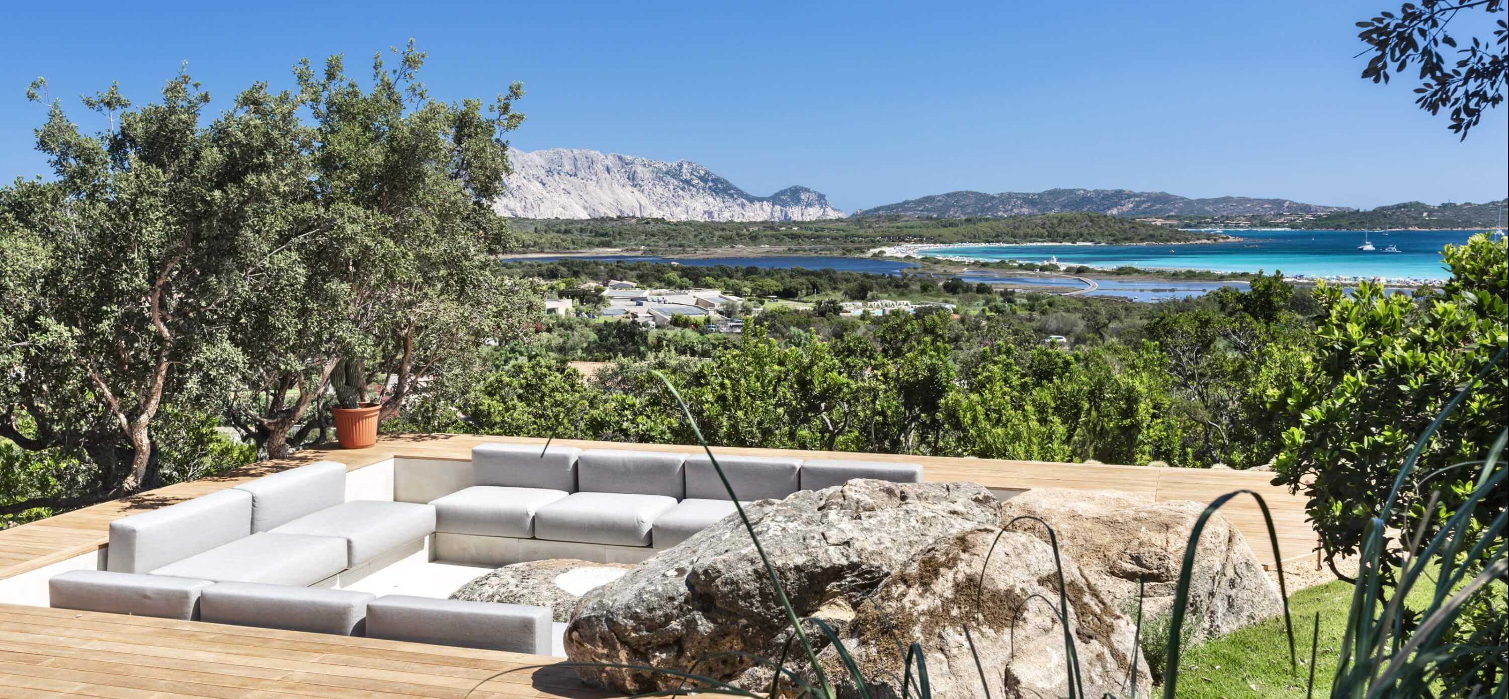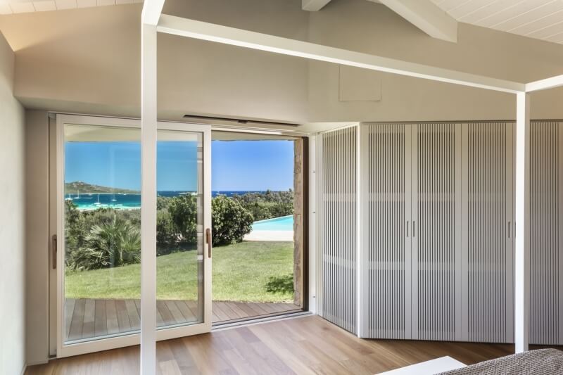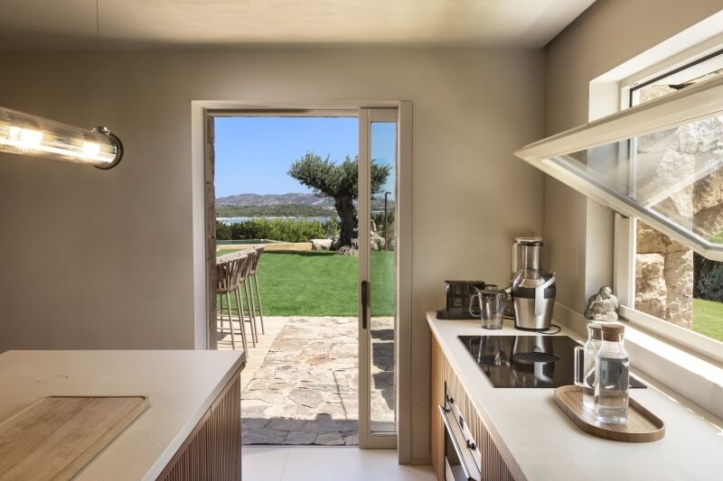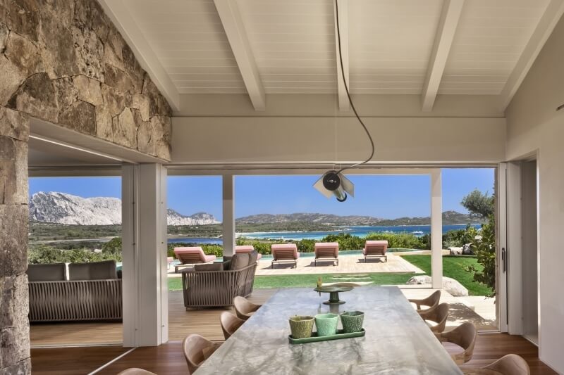 De l'autre côté, la deuxième porte coulissante du patio, orientée vers le nord, offre une vue imprenable sur la plage de Lu Impostu et l'île de Tavolara.