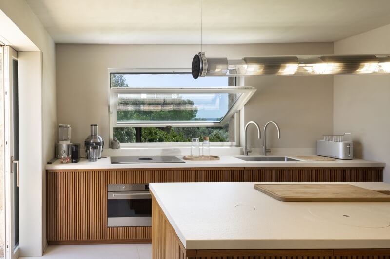 À droite de la véranda, vous trouverez un grand salon lumineux et élégamment meublé, suivi de la salle à manger avec une façade en verre élégante et une grande table en marbre avec une base en bois qui se transforme en une cuisine entièrement équipée.