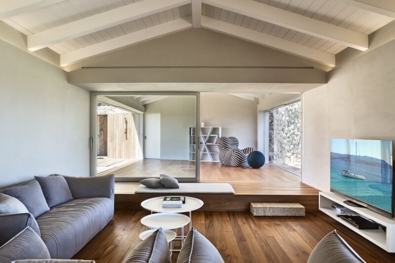 Une première porte coulissante vers le sud mène à un grand patio lumineux qui sépare la zone de vie de la zone de sommeil et offre une vue magnifique sur la plage de La Cinta et la lagune de San Teodoro.