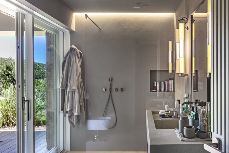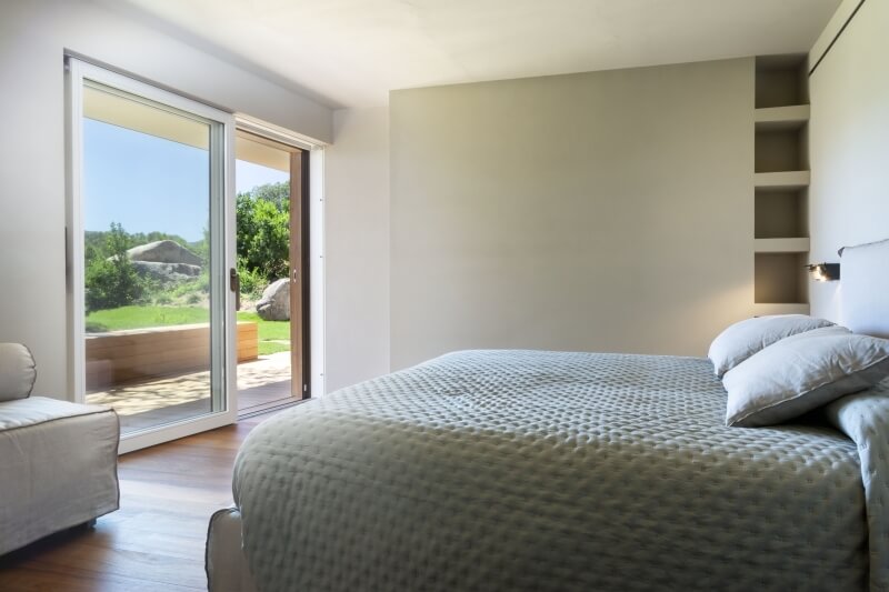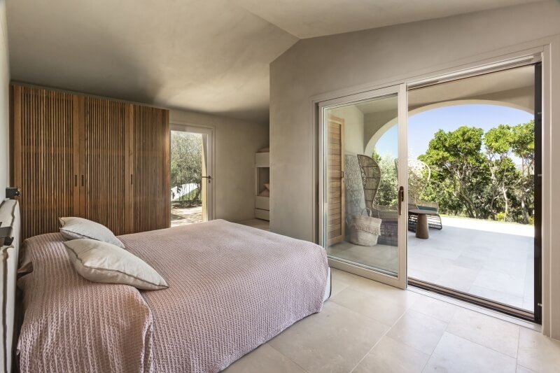 À gauche du patio, donnant sur la plage de Lu Impostu, se trouve la chambre principale avec sa salle de bains privative et une porte coulissante permettant un accès direct au jardin avec pelouse anglaise, offrant une vue splendide sur la plage inférieure et l'île de Tavolara.