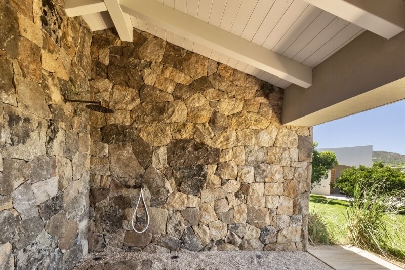 La villa dispose de plusieurs vérandas offrant une vue imprenable sur la mer, permettant aux invités de profiter de moments de détente dans la zone de vie extérieure et d'heures conviviales avec la douce brise marine. En plus des vérandas, la villa est dotée d'un espace barbecue directement relié à la cuisine et à la salle à manger, ainsi que d'un espace idéal pour un apéritif au coucher du soleil. Cet espace se caractérise par sa forme rectangulaire, offrant divers canapés et un rocher de granit au milieu servant de table naturelle.