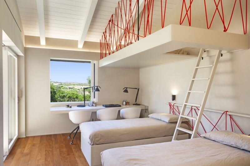 À côté de la chambre principale se trouve une chambre d'enfants avec deux lits simples, une armoire, un bureau et une petite mezzanine avec un troisième lit accessible par un escalier en bois. Cette chambre dispose également de sa propre salle de bains et d'une porte coulissante donnant accès au jardin.