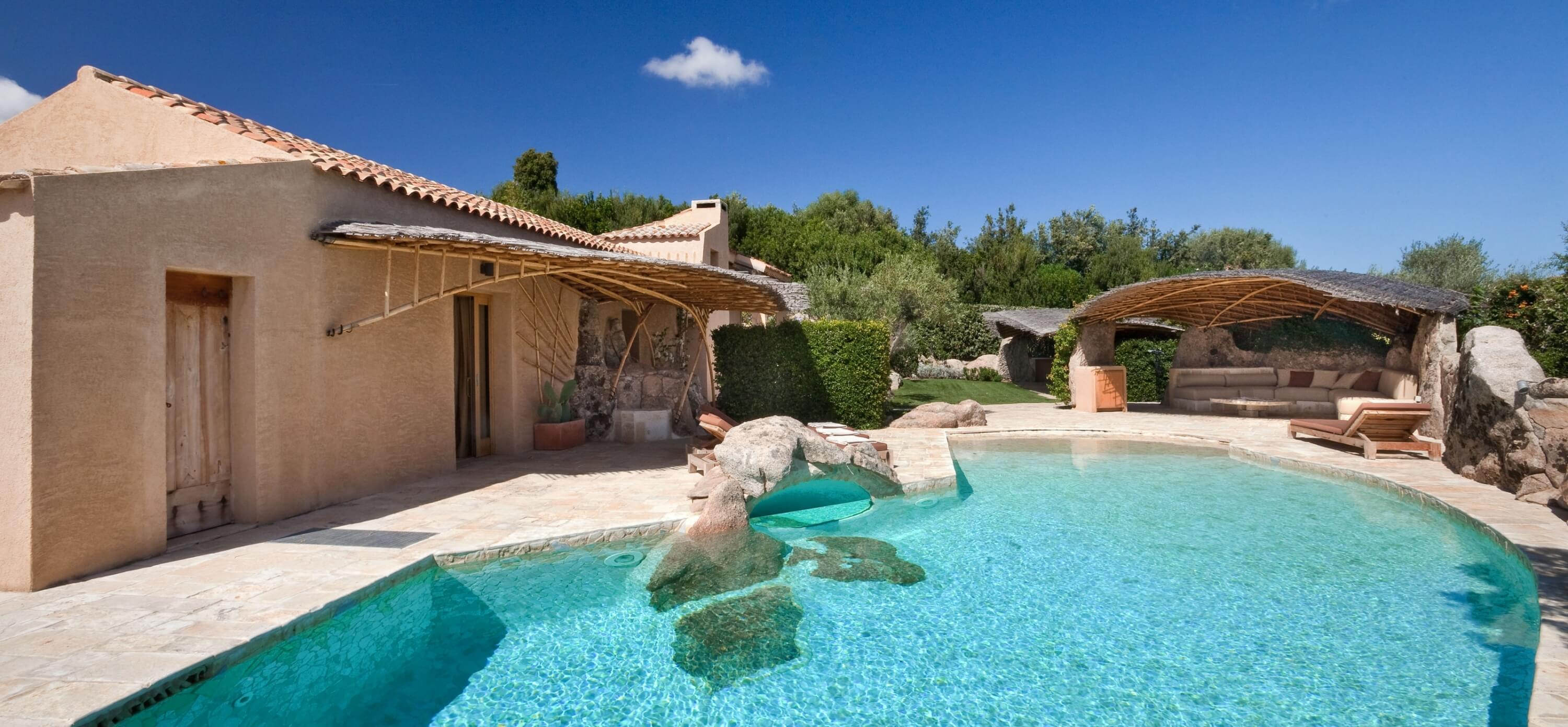 • une piscine de 60 mètres carrés en marbre sarde d’Orosei équipée d'un système de nage à contre- courant et filtration/chloration au sel - électrolyse.