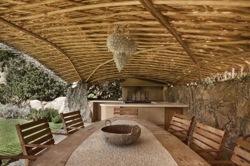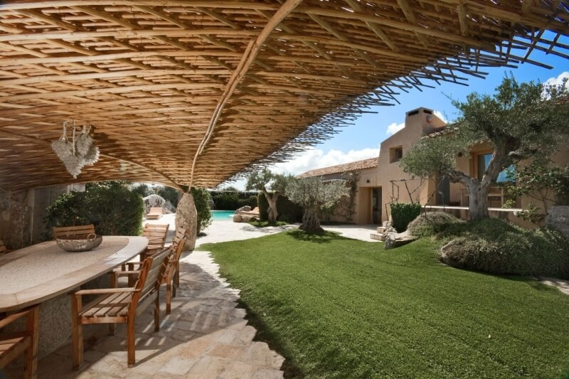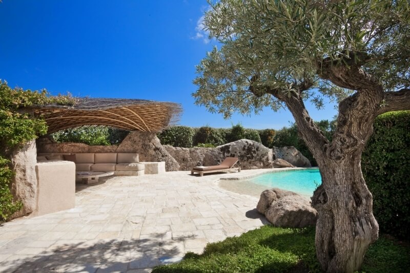 Pour compléter l'aménagement extérieur, il y a de nombreux monolithes en granit sarde, des dallages en marbre et un jardin avec des plantes centenaires sur la majeure partie du périmètre du terrain.