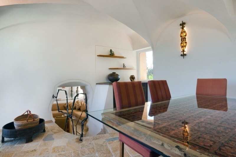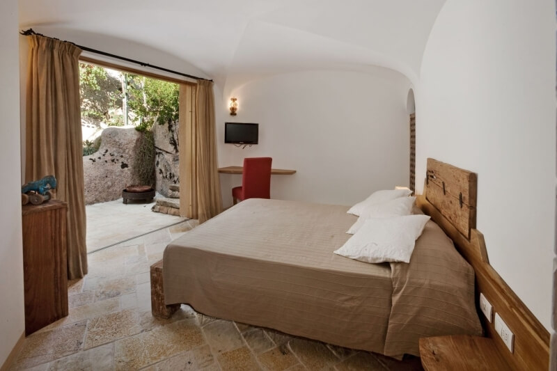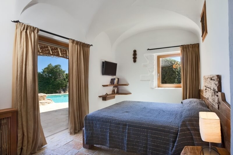 L'une des chambres dispose d'un "hublot" donnant sur la piscine. L'autre, donne accès à une cour avec des plantes et un mur en granit . Vous serez impressionné par les murs intérieurs,d'origine, et en pierre apparente, ainsi que par le plafond aux poutres apparentes. Les sols et les murs sont en marbre sarde.