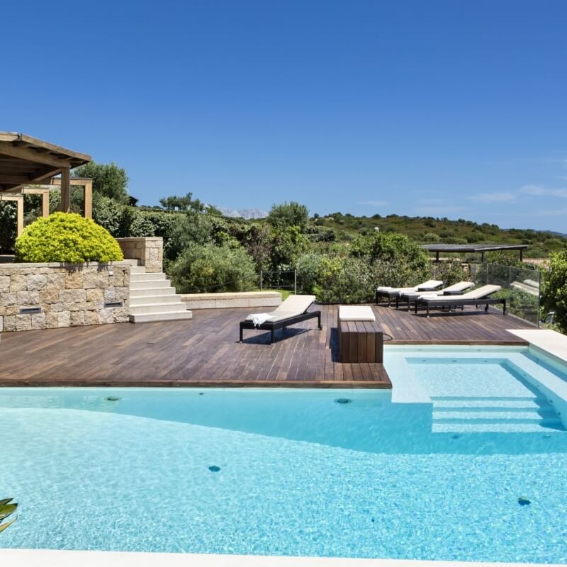 La villa si trova nella parte nord del villaggio I Giardini d’Aldia, a circa 300 metri dall’ingresso principale e gode di una bellissima vista sulla spiaggia di La Cinta e sulla spiaggia di Lu Impostu; è edificata su due livelli, piano terra e piano seminterrato, quest’ultimo con porte scorrevoli completamente fuori terra che affacciano sul giardino.
