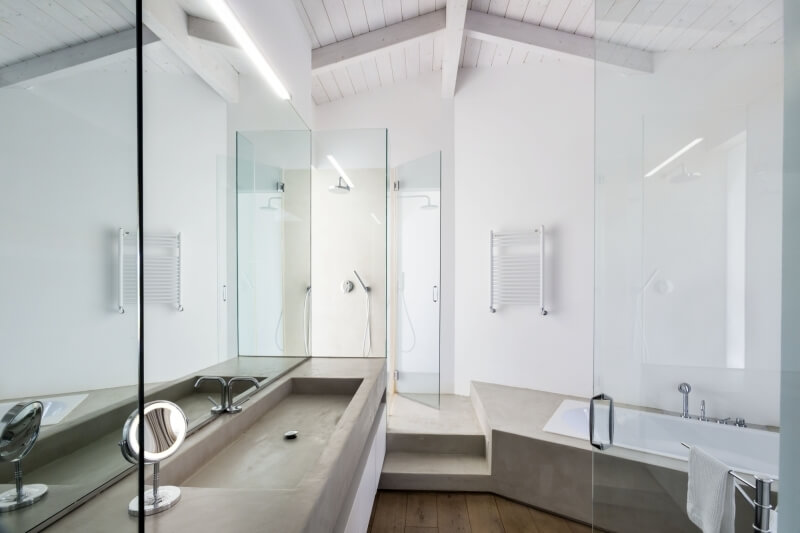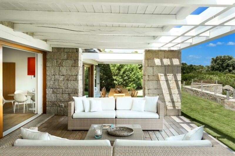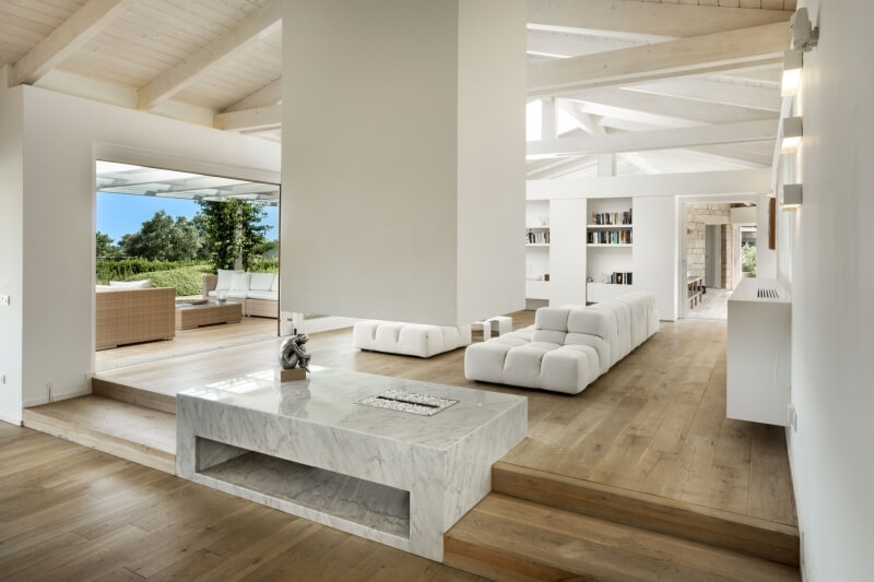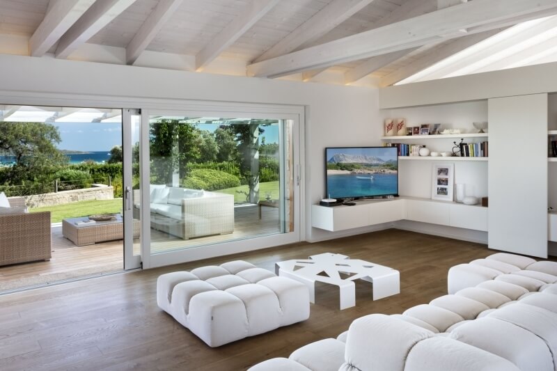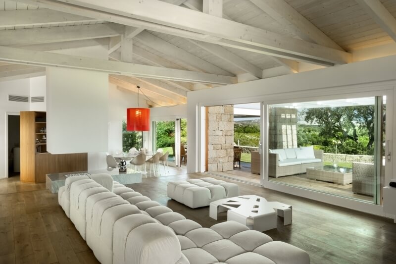 Il sentiero pedonale termina sugli scalini che conducono al patio interno, il quale divide due grandi aree: sulla sinistra del patio una grande vetrata con ante scorrevoli introduce alla grande zona giorno, molto luminosa e con comodo e spazioso divano di colore bianco al centro del vano, dal quale è possibile godere della bellissima vista sul mare attraverso le porte scorrevoli che danno sulla veranda. Sulle vetrate, le tende di colore bianco danno ancora più luminosità al soggiorno, coadiuvate dalle travi a vista del soffitto, anch’esse di colore bianco.
