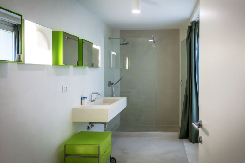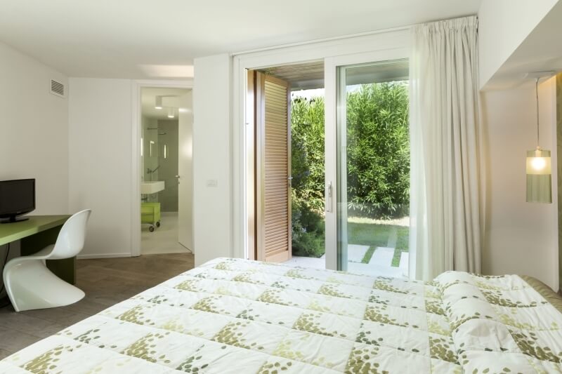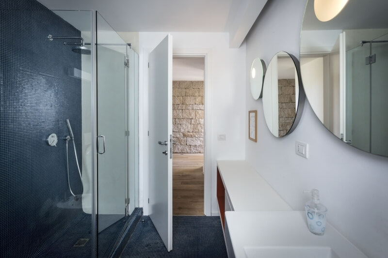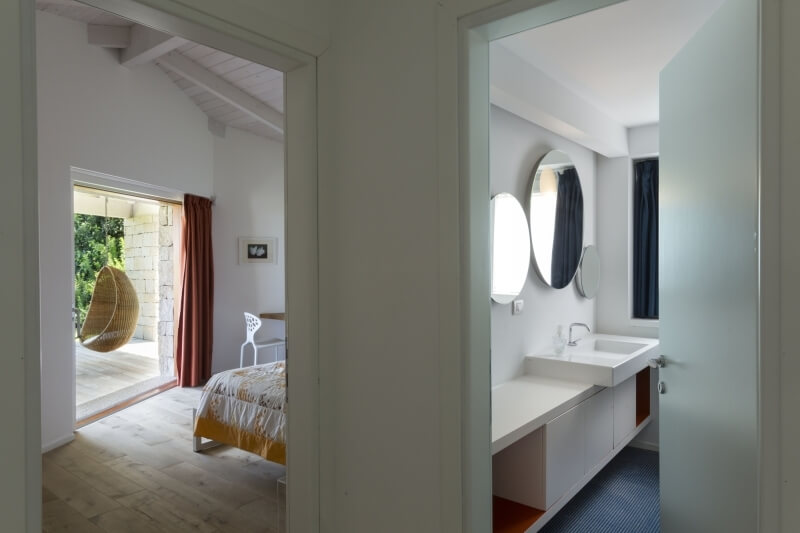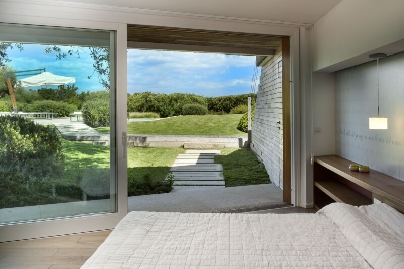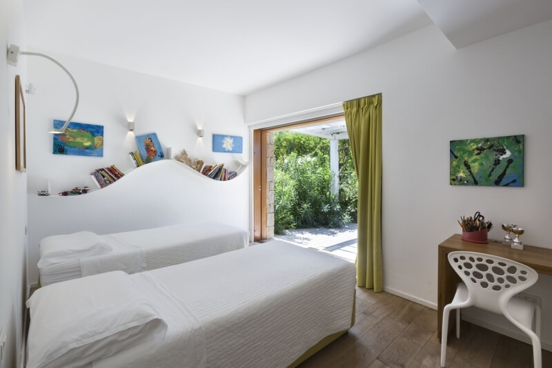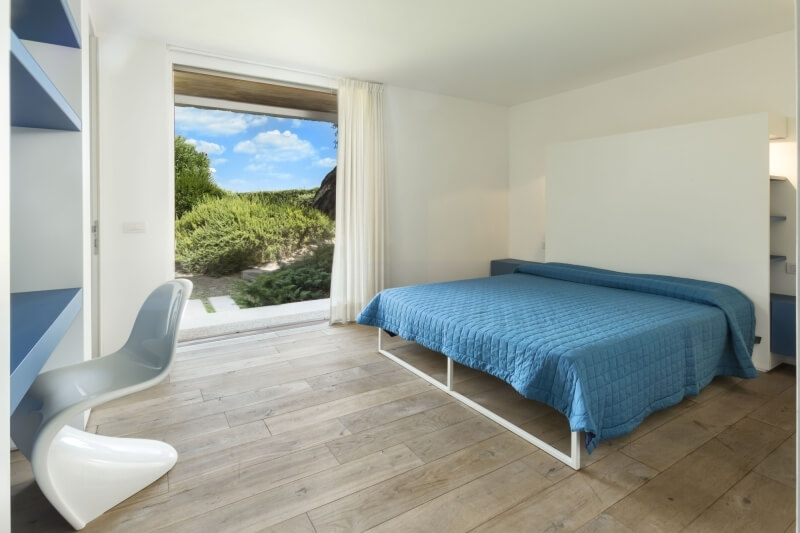 Sulla destra del patio, si accede alla zona notte del piano terra, con tre camere da letto e due bagni; gli arredi delle camere da letto sono tendenti ai colori chiari, così come le tende sulle vetrate, sempre per dare luce e luminosità agli ambienti. Come per il lato opposto, anche in questo lato della villa le camere hanno la vista sul mare e l’uscita privata sulla veranda. Dalla veranda, subito dopo il patio, una serie di scale in lastre di granito portano al livello inferiore, il quale contiene 4 camere da letto con bagno en suite, tre delle quali sulla parte sinistra guardando il mare e una sulla parte destra.