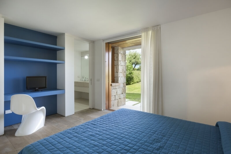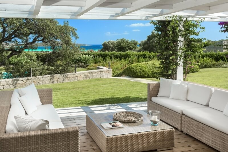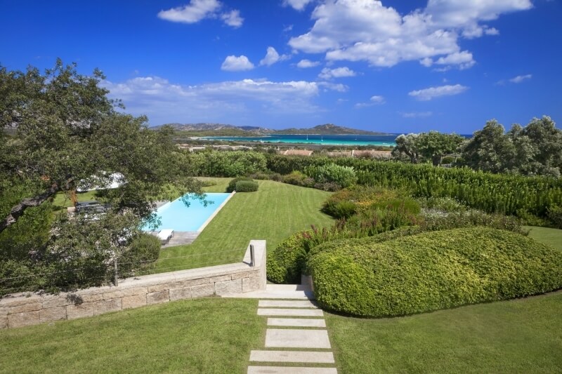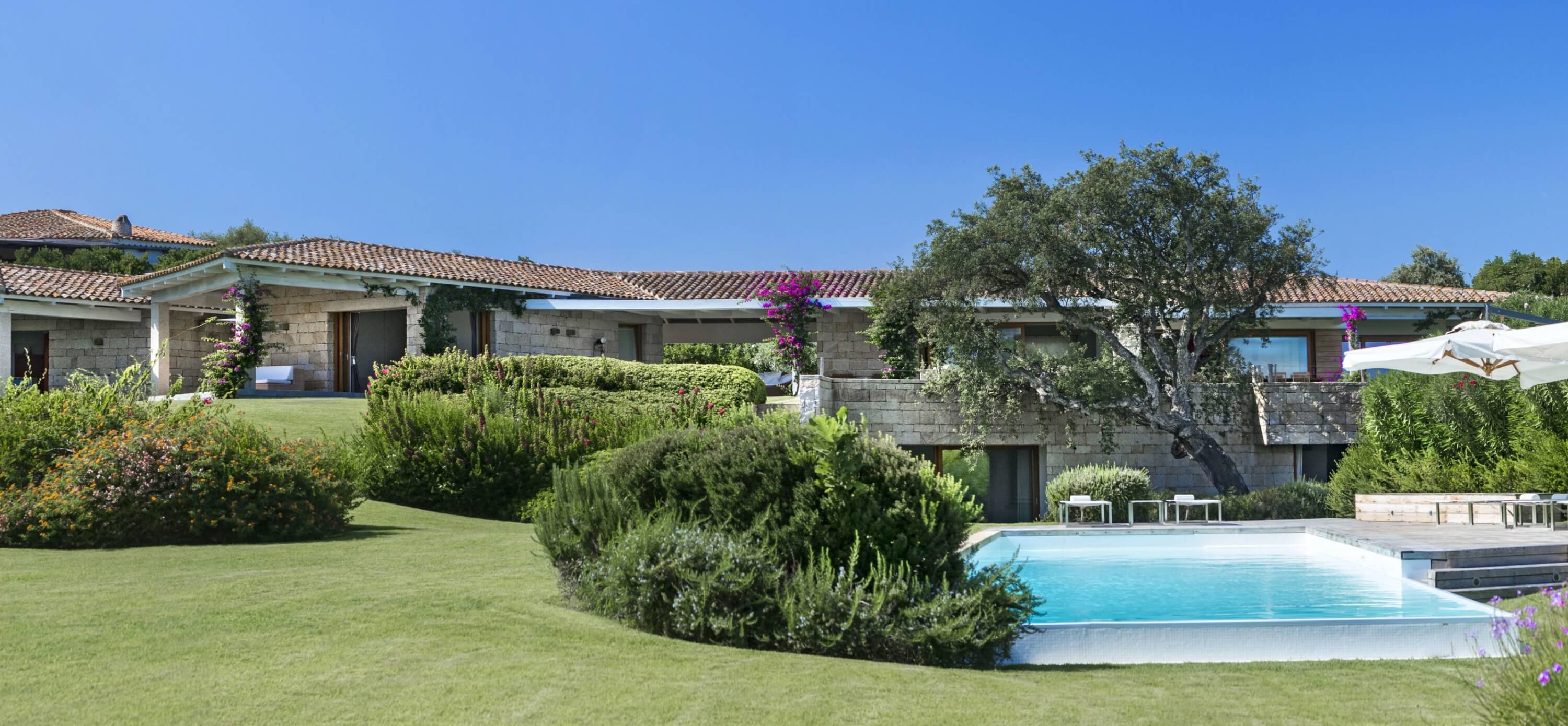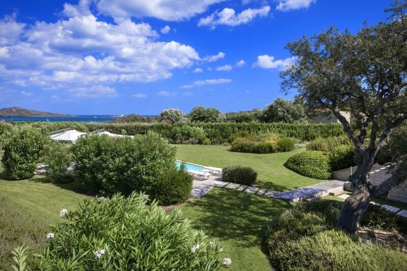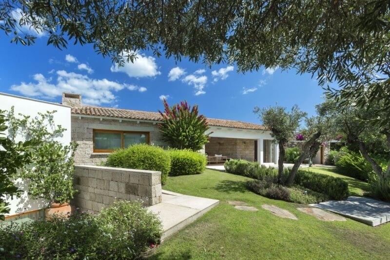Il giardino, per una metratura totale di 4.000 mq, ha il prato inglese in tutto il perimetro ed è ornato con piante autoctone quali corbezzolo, rosmarino e querce da sughero. Anche le facciate esterne dalla villa richiamano lo stazzo gallurese, in quanto sono ricoperte da piccoli blocchi di granito, esattamente come le antiche costruzioni. La piccola collina sulla quale la Villa è edificata, offre una posizione panoramica e allo stesso tempo una posizione tranquilla dove trascorrere le vacanze in condizioni di assoluta privacy.