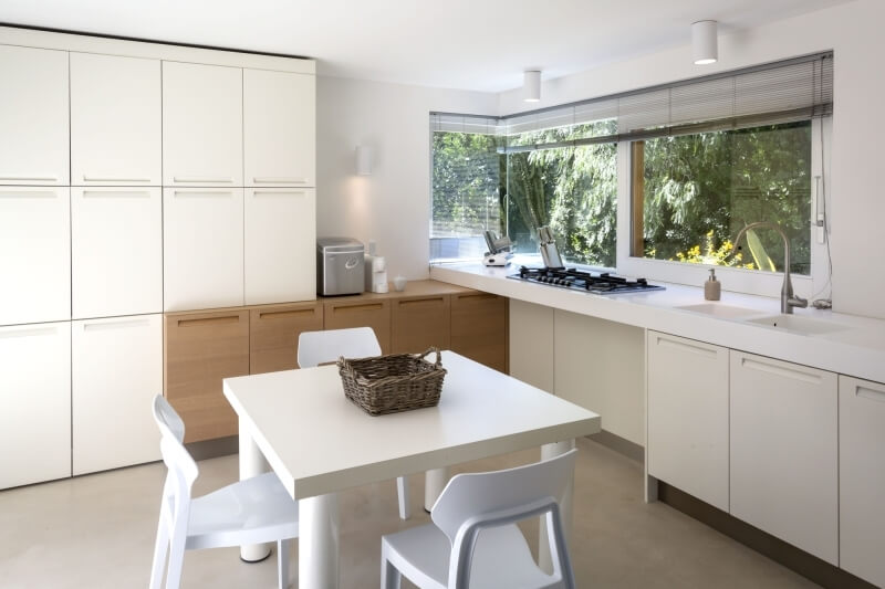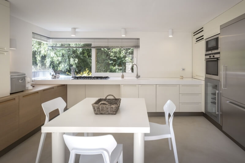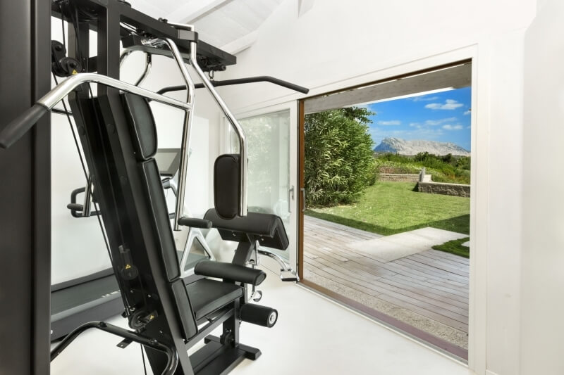 Dal soggiorno si accede all’ampia cucina, dotata di tutti i comfort, di colore bianco candido e con tavolo al centro; la zona fitness, anch’essa con affaccio sulla veranda e vista sul mare, è accessibile sia dall’esterno che dal soggiorno; tutti gli ambienti della zona giorno sono serviti da un unico bagno.