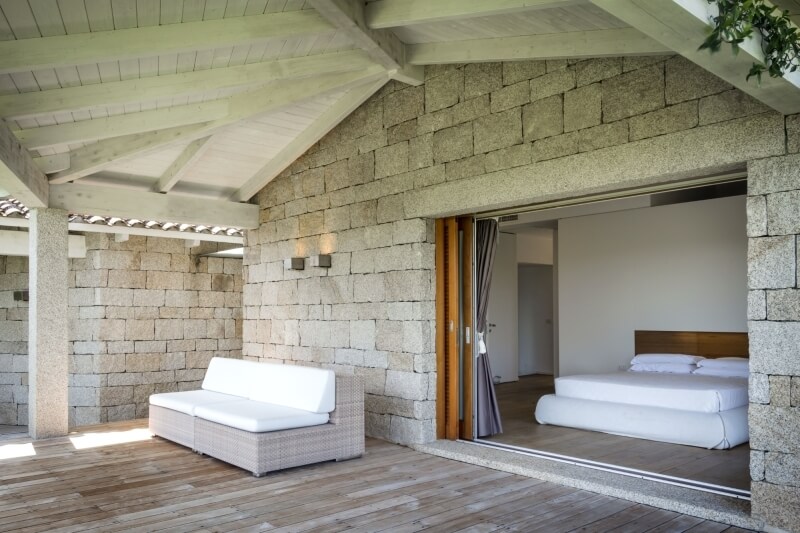 Come per le altre ville del Villaggio, anche Hibiscus, dal punto di vista della tipologia costruttiva, richiama fortemente lo Stazzo Gallurese, dato il tetto a due falde con travi in legno a vista sul soffitto. Il patio, così come le verande, sono tutti arredati con salotti esterni e cuscini bianchi, oltre al tavolo capace di ospitare 12 persone nei momenti conviviali.