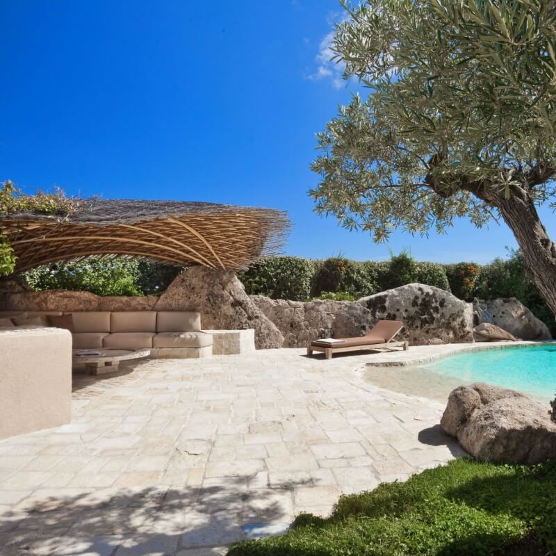 A completamento dell’arredo esterno sono presenti, su buona parte del perimetro del lotto, numerosi monoliti in granito sardo, pavimentazione in marmo e giardino con piante secolari.