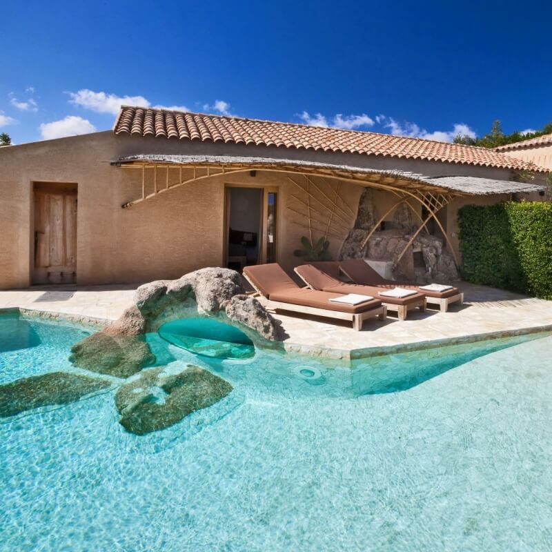 Una camera da letto è dotata di una finestra "oblò" immersa nella piscina, l’altra accede ad un cortile che ha di fronte una parete di monoliti in granito e piante. Resterai colpito dalle pareti interne rimaste originali in pietra a vista, così come originale è il soffitto con travi a vista. Pavimenti e rivestimenti sono stati realizzati in marmo sardo.